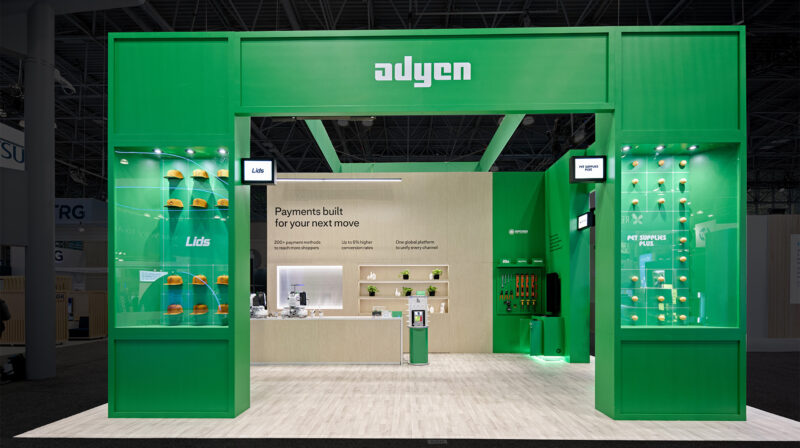 At NRF 2026, 3D Exhibits partnered with Adyen to deliver a high-impact, double-deck experience that reflected how enterprise retail decisions actually happen. The space combined customer-driven activations with live demonstrations of Adyen’s payments platform, including a Joe & The Juice coffee bar powered by real-time ordering technology, a LIDS custom hat experience with on-site embroidery, and a terminal wall featuring 70 synced devices for live brand-switching demos. High-energy engagement was intentionally anchored to the main floor, while private and climate-controlled meeting spaces above supported focused conversations and deal-making, creating a balanced environment designed for both momentum and outcomes.