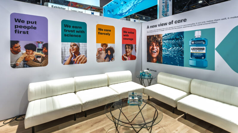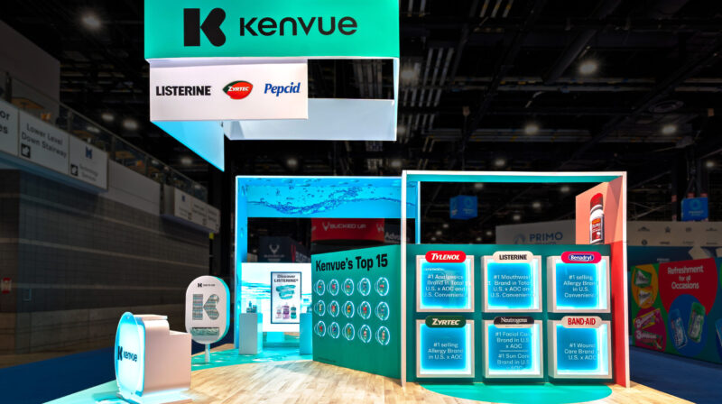 Movement became the organizing idea behind Kenvue’s 30×30 presence at NACS 2025, drawing inspiration from the natural pour and flow of Listerine. A bold, four-sided overhead banner pulled attendees in, then guided them through an intuitive journey highlighting Kenvue’s top 15 products and key claims via layered graphics, interactive touchscreens, and sculptural digital moments. The dedicated Listerine zone stood out with three-sided LED screens, animated wave content, and mirrored floor graphics that fully wrapped visitors in the brand story, while private meeting rooms supported focused conversations. The overall experience balanced visual energy with clarity, creating a space that was easy to navigate, engaging to explore, and impactful on a crowded show floor.