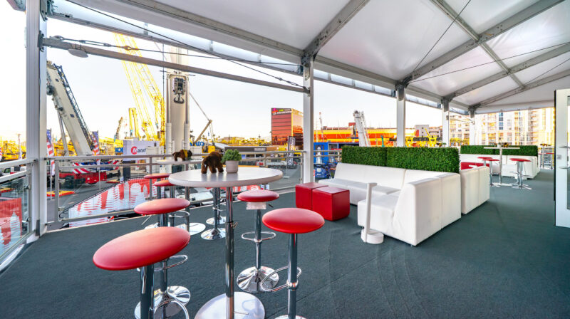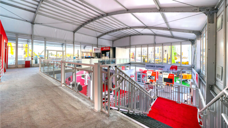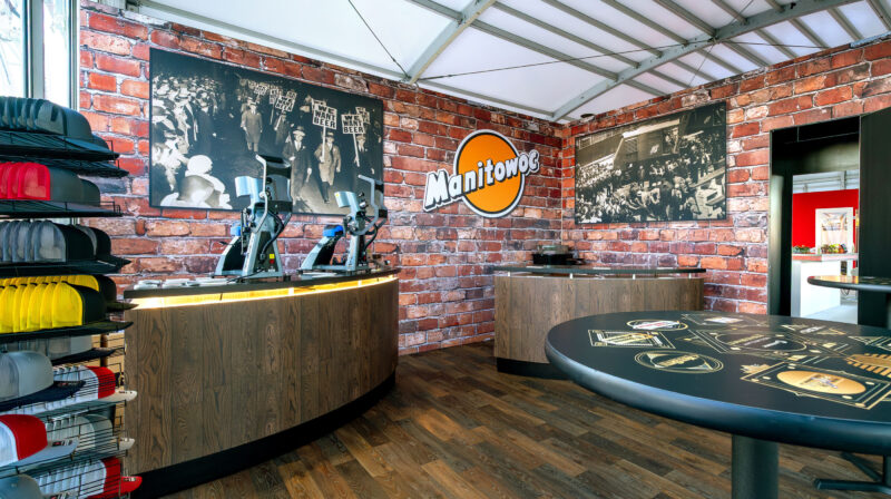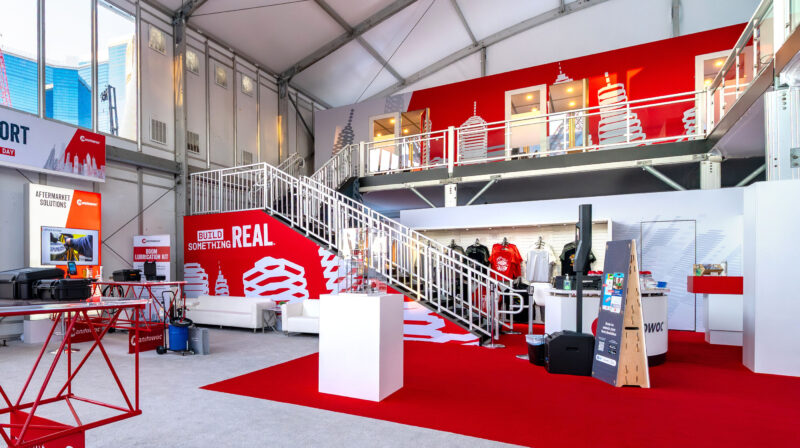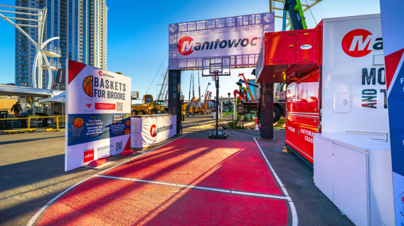 At CONEXPO-CON/AGG 2026 in Las Vegas, Manitowoc Crane’s 160′ x 130′ exhibit converted an outdoor footprint into a climate-controlled destination that guided attendees through a structured journey. A dedicated viewing deck showcased a new crane model at the center of the space, while a retail shop, terraces, and private conference rooms surrounded it. A charitable basketball activation and custom tables built from crane boom components brought the brand into every corner of the floor. A VIP speakeasy, accessed through a hidden door inside a Pepsi machine, became the defining moment of the show.