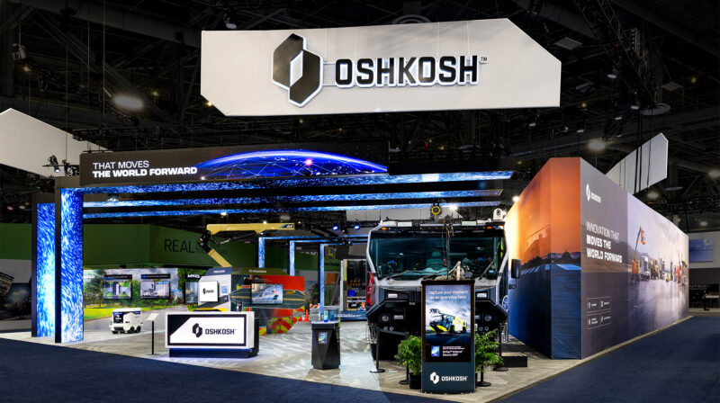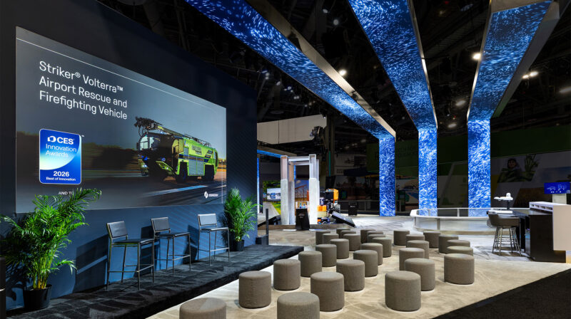 At CES 2026, 3D Exhibits created an immersive, tunnel-driven experience that positioned Oshkosh Corporation as a technology leader focused on real-world impact. Designed to block visual noise from neighboring exhibits, the environment guided attendees through future-focused zones highlighting job sites, airports, and neighborhoods, supported by live demos, tech talks, and hands-on interactions. From an IMAX-style theater showcasing connected airport operations to award-winning robotics demonstrations and interactive safety simulations, the space translated complex systems into tangible experiences, driving extended dwell time and reinforcing Oshkosh’s commitment to purposeful innovation.