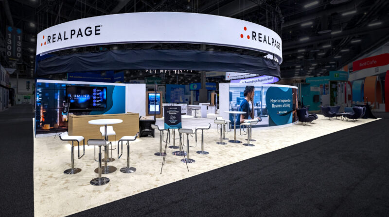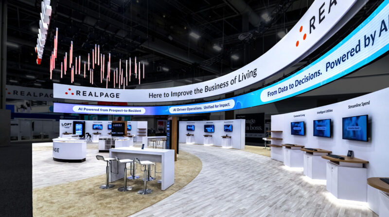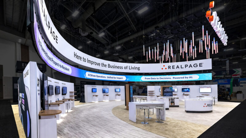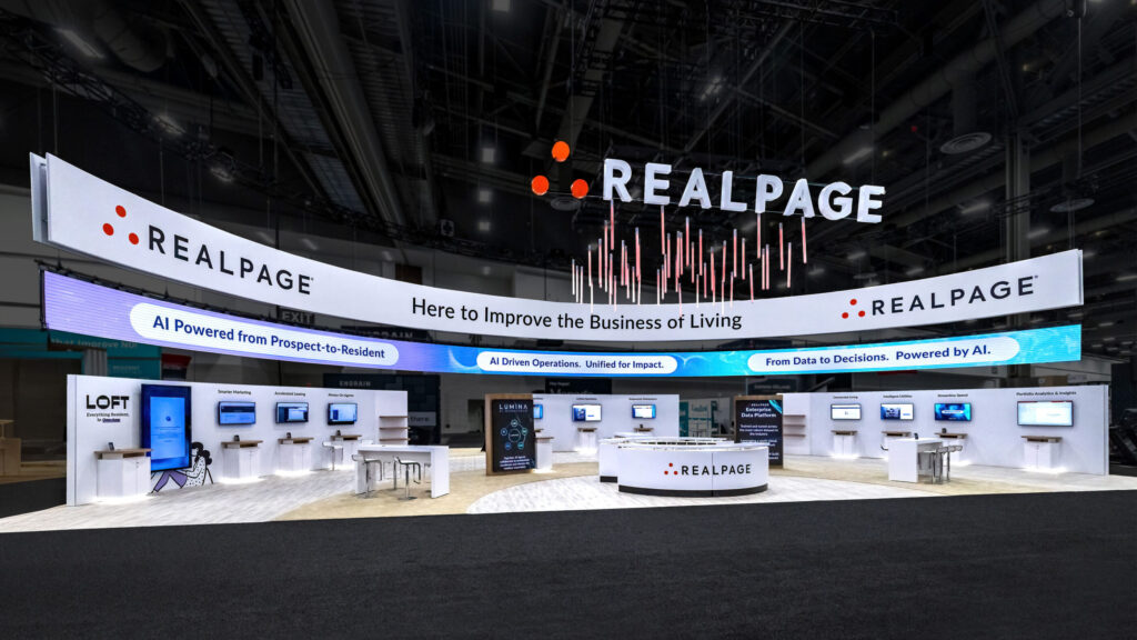 At Apartmentalize 2025, RealPage invited attendees into a space that felt alive—fluid, intelligent, and intentionally human. The 50×80 environment centered around a glowing core of sculptural LED tubes, radiating light that visually connected the three pillars of RealPage’s new AI platform, Lumina. Surrounding this centerpiece, curved walkways and layered digital displays created an easy, intuitive flow that guided visitors through stories of innovation and insight. The design balanced openness with purpose—each zone offering its own rhythm of conversation, discovery, and connection.