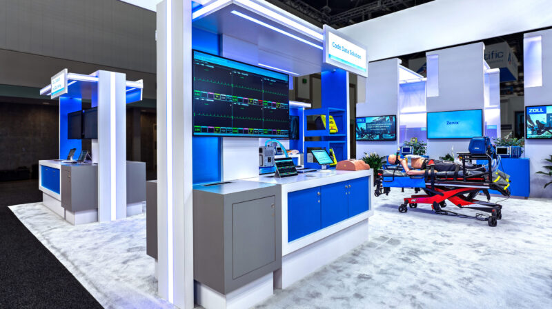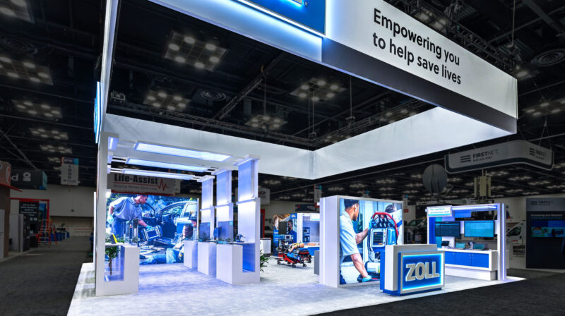 At EMS World 2025 in Indianapolis, ZOLL unveiled a fully custom, patient-first exhibit designed to shift the conversation from individual products to a complete continuum of care. The 40×40 island centered on an immersive, walk-through tunnel that placed attendees inside a realistic EMS-to-hospital scenario, with each station highlighting a different solution where the actual product was revealed through transparent OLED touchscreen digital demos. The experience was intentionally hands-on and modular, balancing the tunnel with adjacent one-on-one demo areas where ZOLL reps could tailor conversations to specific needs. Throughout the space, reconfigurable workstations, layered SEG fabrics, and integrated lighting allowed the environment to flex for future shows and footprints, reinforcing long-term program value.